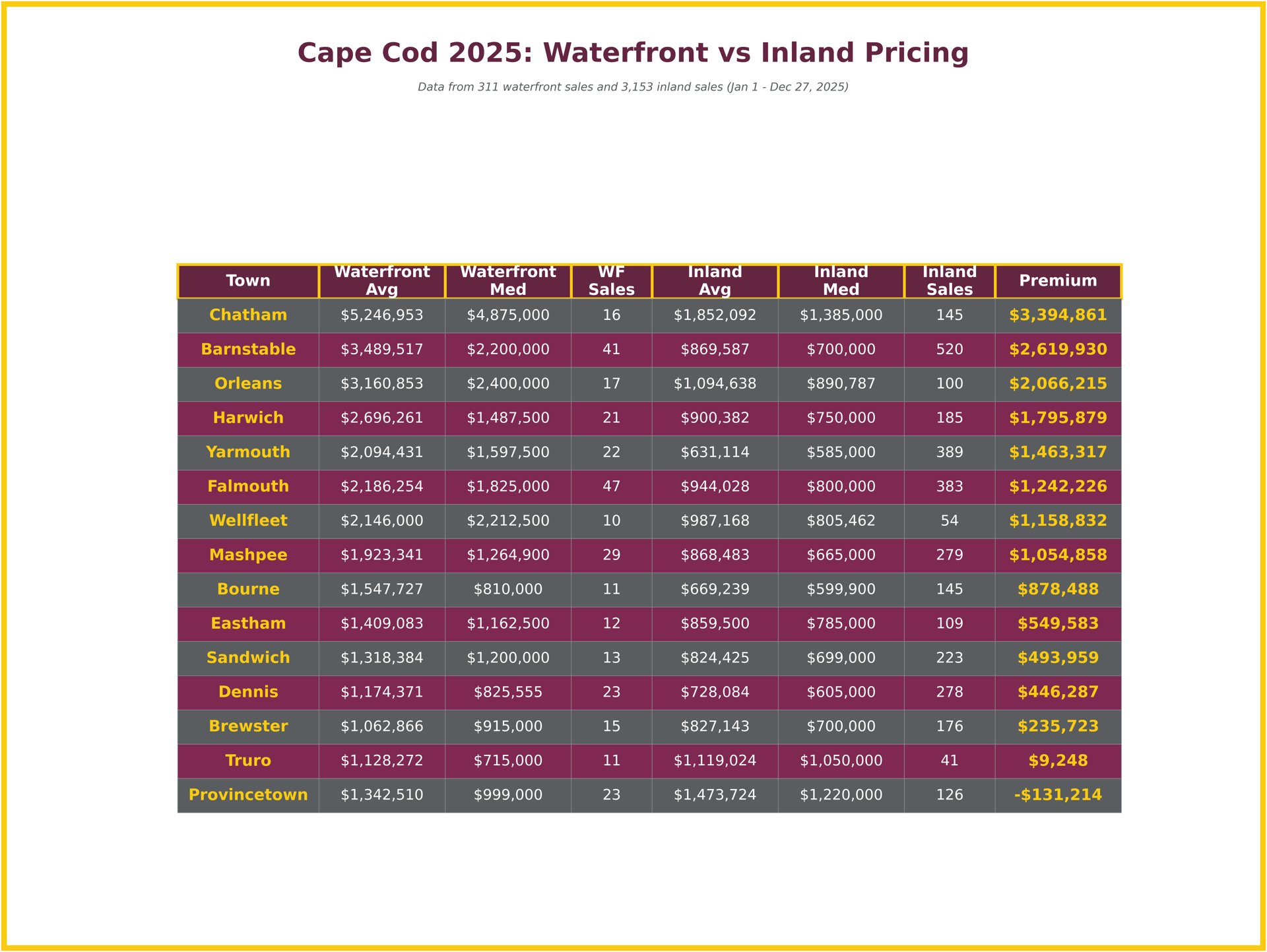 Here's the complete breakdown of 2025 waterfront versus inland pricing across Cape Cod:
