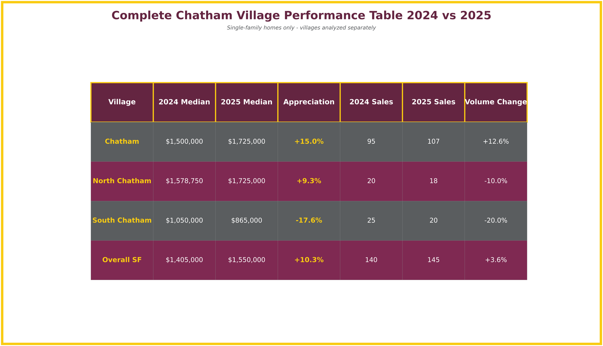 Chatham complete performance table showing all three villages' 2024 vs 2025 medians, appreciation, and sales volume