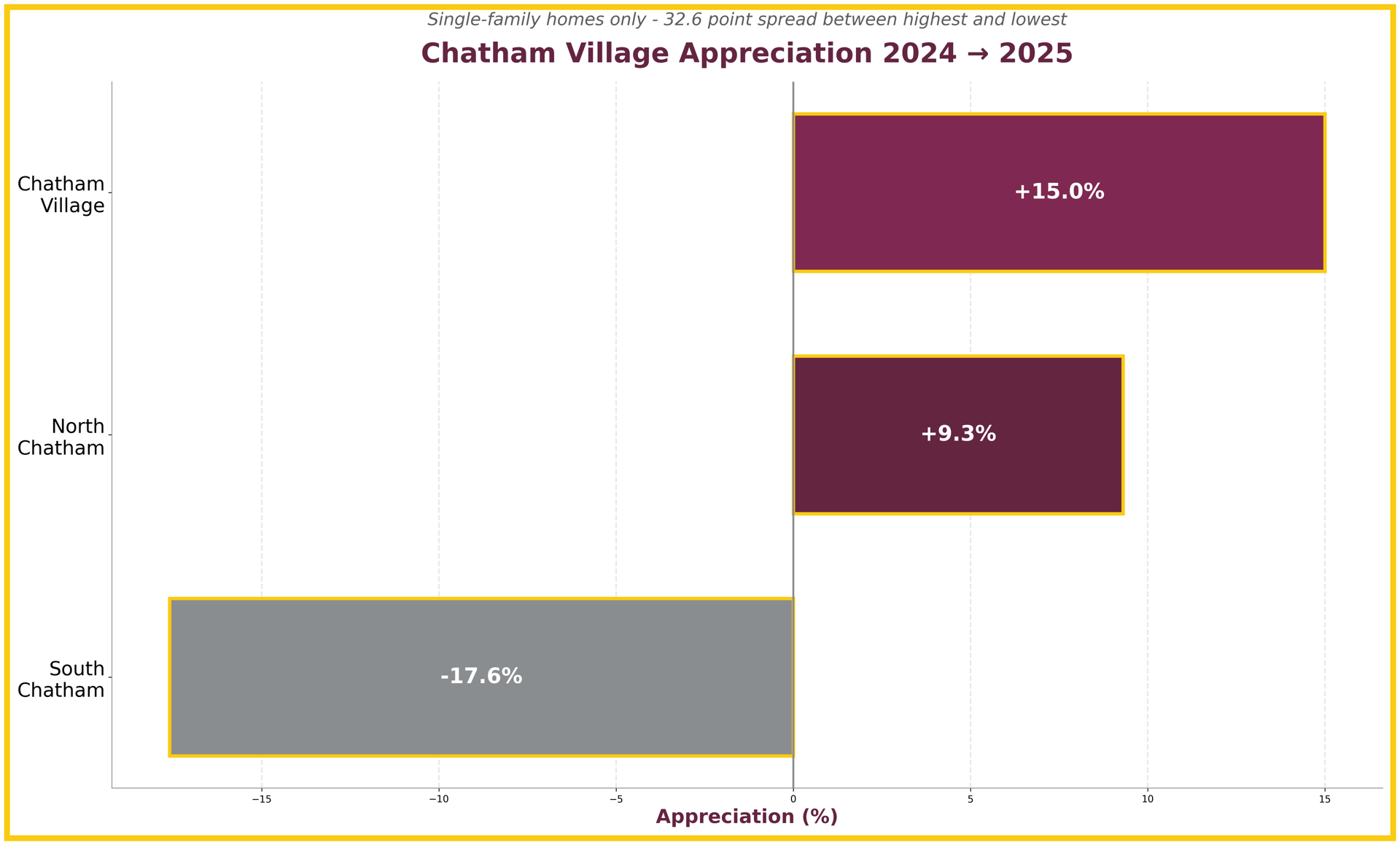 Chatham village appreciation chart showing premium villages up 15% and 9.3% while South Chatham fell 17.6% in 2025