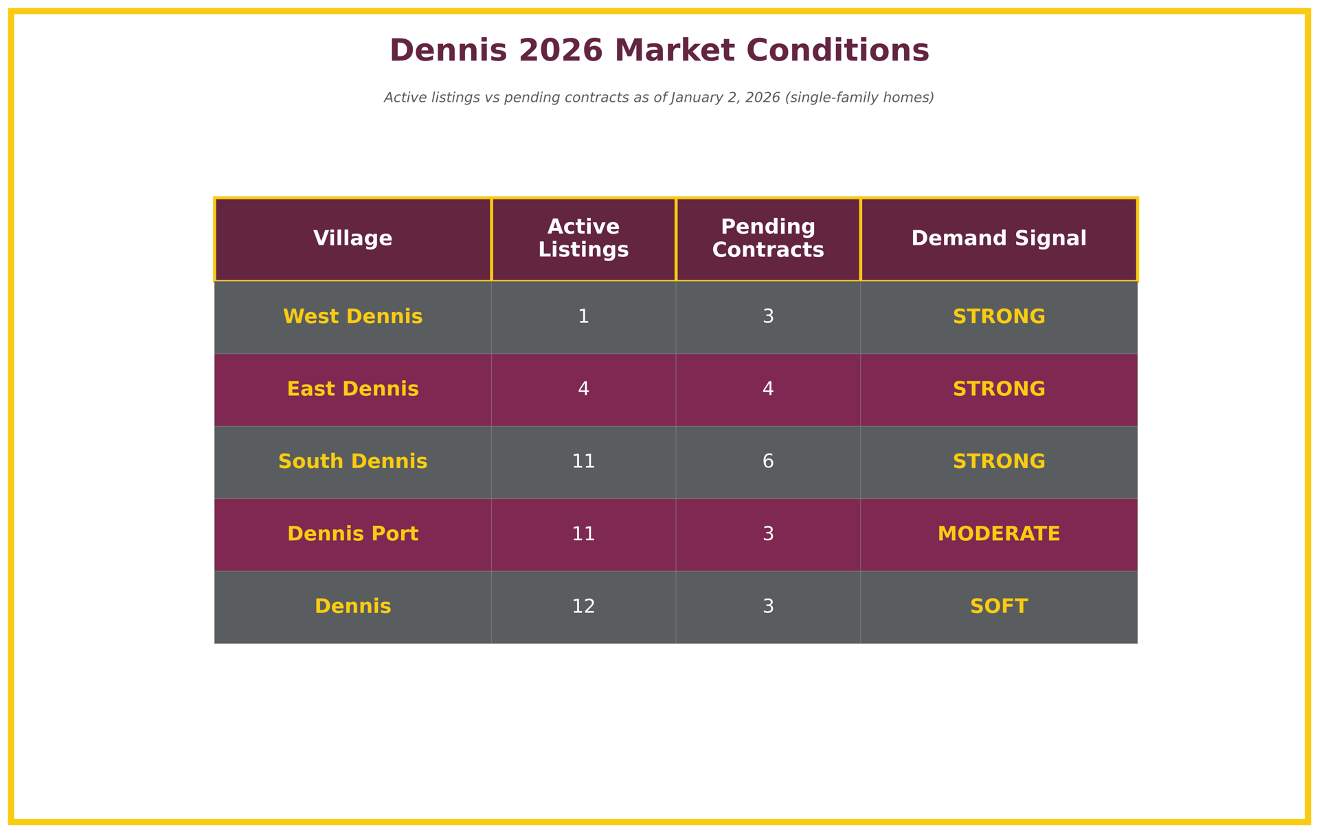 The standout signal for 2026? Only 1 active listing with 3 pending contracts. That's the strongest demand indicator of any Dennis village. Inventory is extremely tight, which means West Dennis could see continued appreciation if more homes don't come on the market.