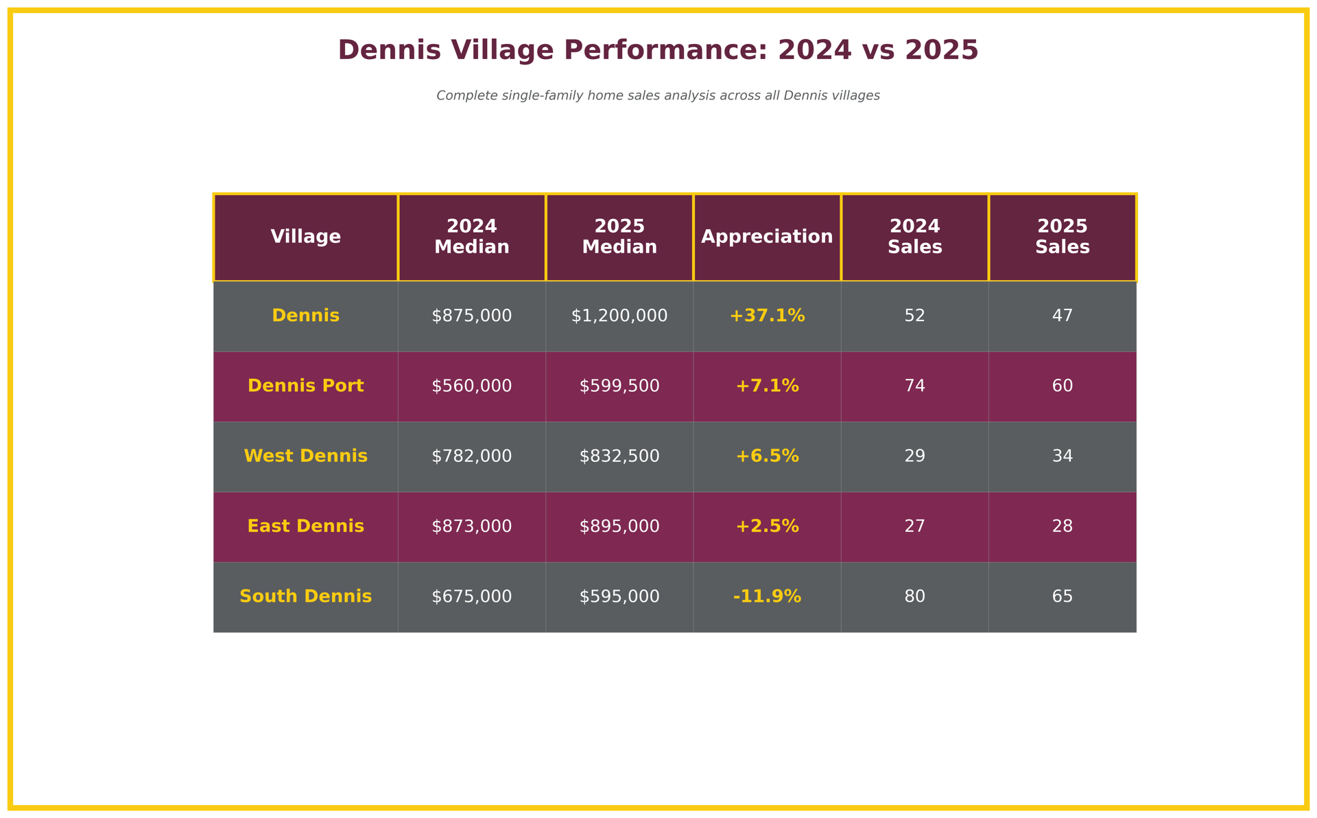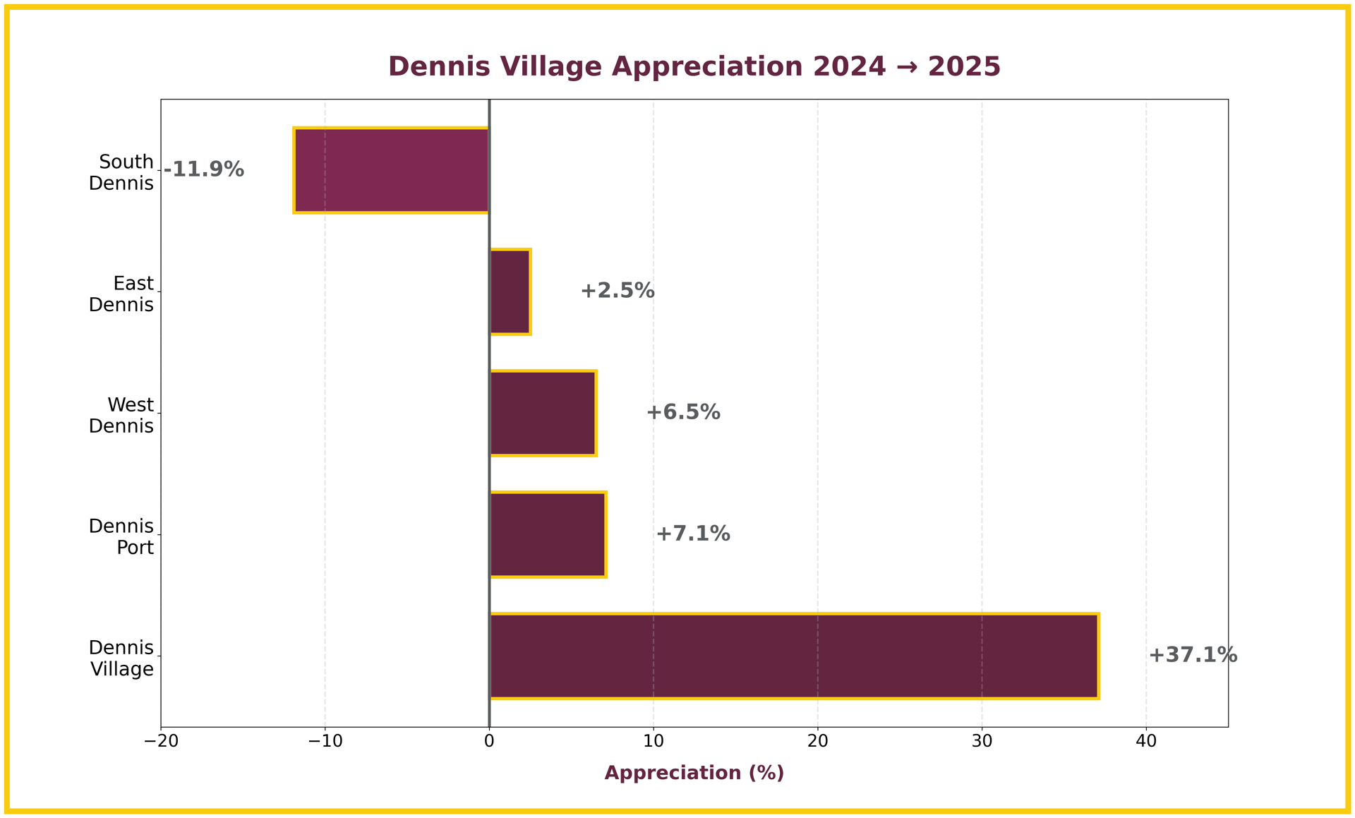 Dennis village dominated Dennis's 2025 market with +37.1% appreciation, the highest in the town, while South Dennis saw the only decline at -11.9%—revealing sharp value differences within a single town.