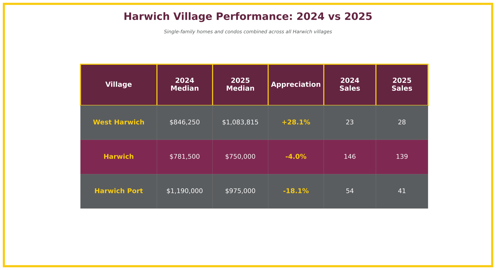 Note: South Harwich had only 1 sale in 2025 and zero sales in 2024, insufficient data for meaningful village comparison. This analysis focuses on the three villages with adequate transaction volume: Harwich Port, Harwich village, and West Harwich.