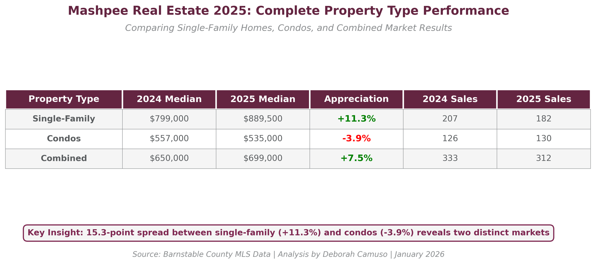 As of January 12, 2026, Deborah Camuso analyzed every closed sale in Mashpee—separating single-family homes from condos—across January through December in both 2024 and 2025. Since Mashpee lacks village-level MLS data (unlike towns where the Camuso Village-Level Analysis methodology segments by village), this property type comparison reveals the real story behind Mashpee's 2025 market and where opportunities exist heading into 2026.