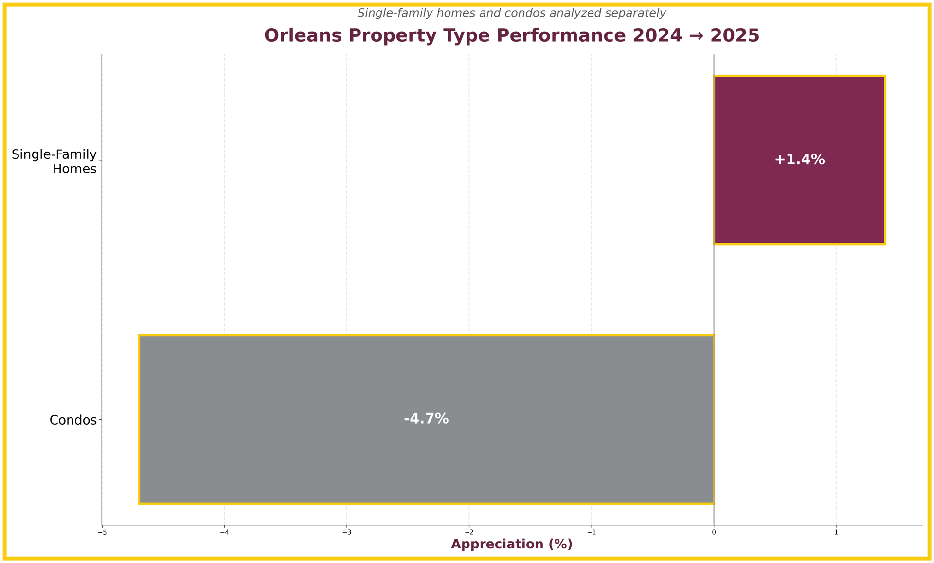 Orleans property type performance chart showing 1.4% single-family appreciation and 4.7% condo decline in 2025