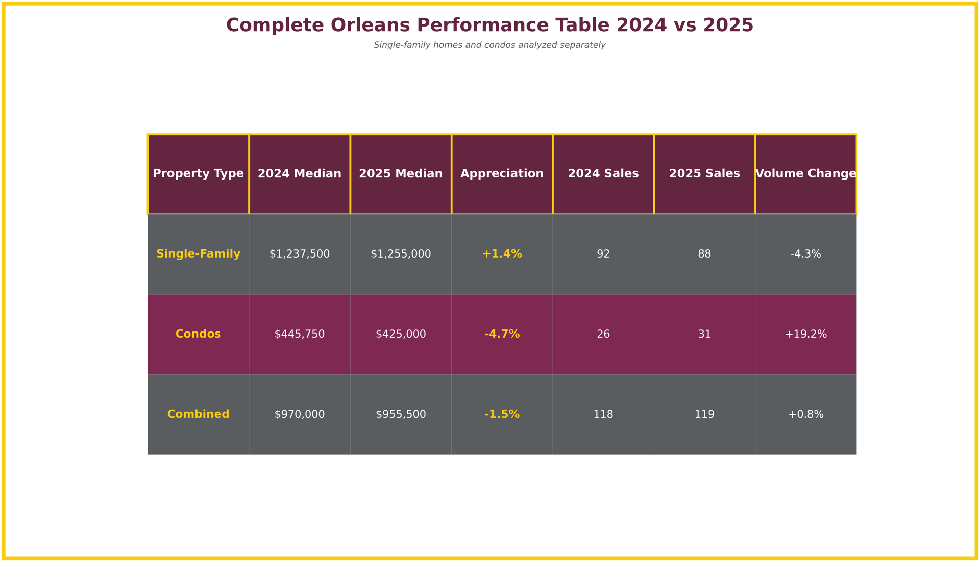 Orleans complete performance table 2024 vs 2025 showing sales volume, median prices, and appreciation by property type