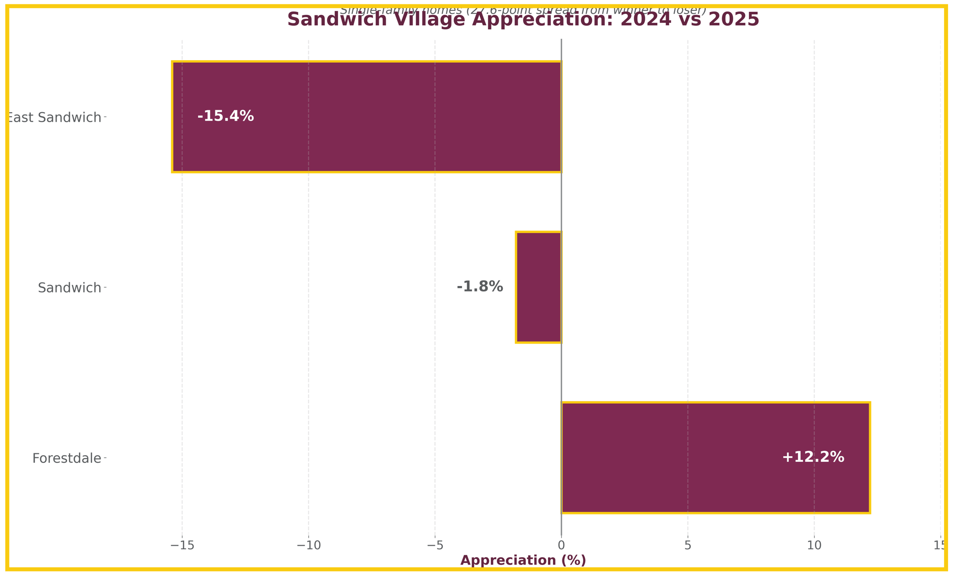 But combined numbers hide the opportunity. Forestdale delivered +12.2% gains for sellers who capitalized on affordability demand while East Sandwich's -15.4% crash created discounts for buyers willing to bet on waterfront recovery. If you're selling or buying in 2026, understanding which village you're in determines whether you win or lose.