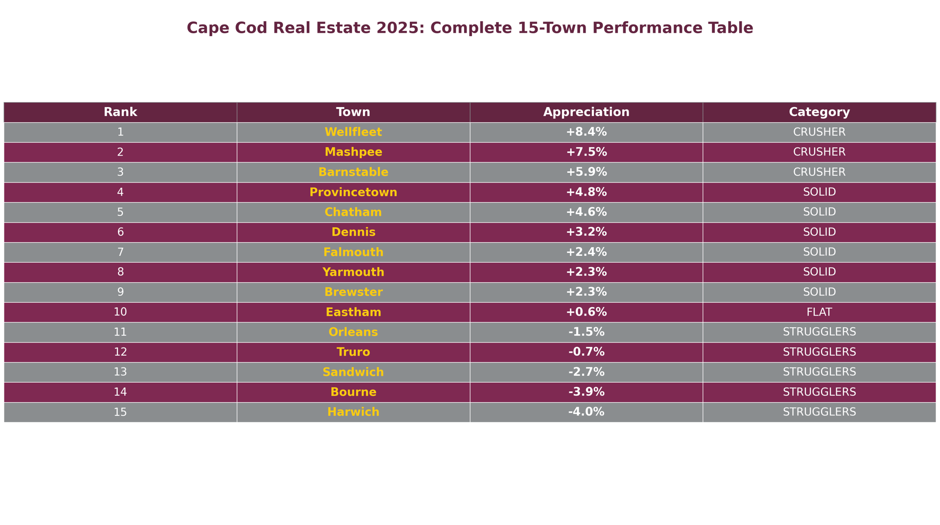 A: Cape Cod buyers became dramatically more selective in 2025, rewarding towns with unique attributes (Wellfleet's art scene, Mashpee's value positioning, Barnstable's village diversity) while punishing generic coastal locations lacking distinctive selling propositions. The 12.4% spread reflects buyer sophistication, not random market movements.