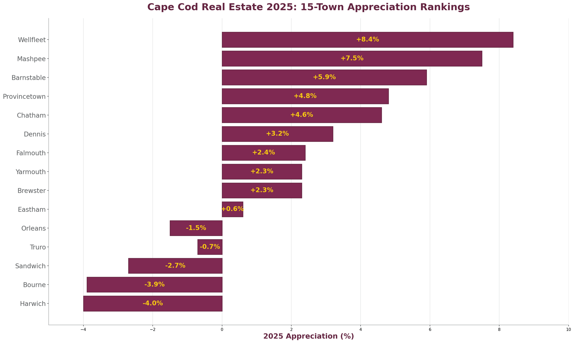 Wellfleet (+8.4%), Mashpee (+7.5%), Barnstable (+5.9%)