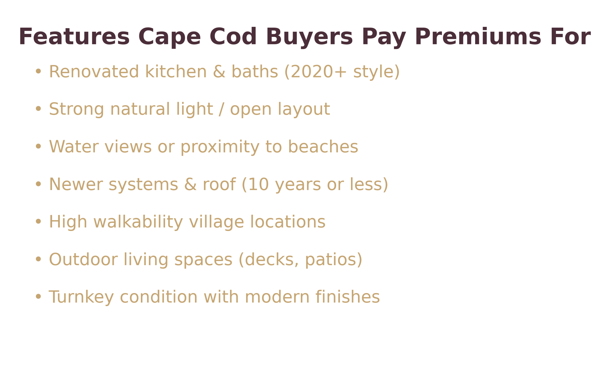 Cape Cod’s strongest homes — by location, light, flow, and updates — should command higher prices.